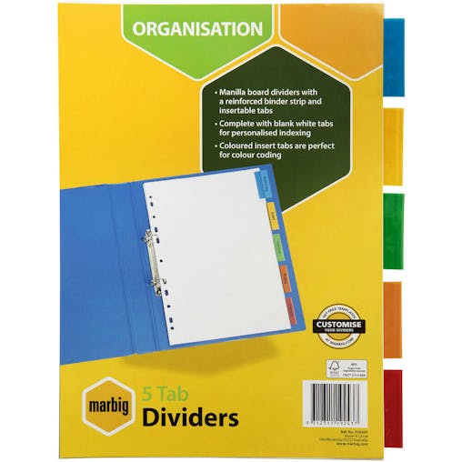 Marbig 5 Insert Tab Manilla Dividers A4 (Coloured)