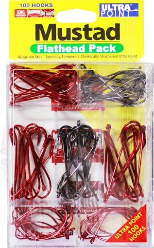 100 Pce Mustad Assorted Chemically Sharpened Flathead Hook Pack in Tackle Tray
