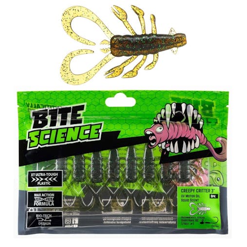 8 Pack of 3 Inch Bite Science Creepy Critter Soft Plastic Lures - UV Motor Oil