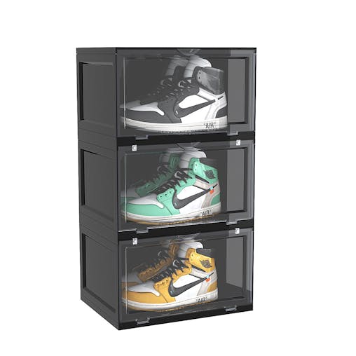 SOGA 3 Tier Black Portable Shoe Organiser Sneaker Footwear Folding Plastic Bin Stackable Storage Box with Magnetic Door